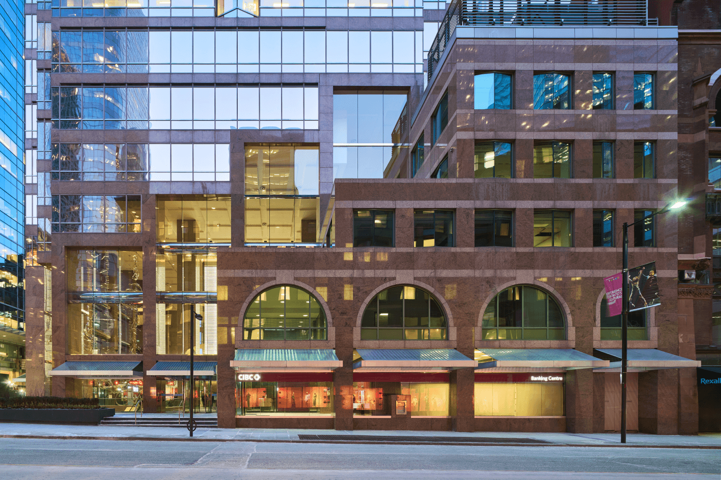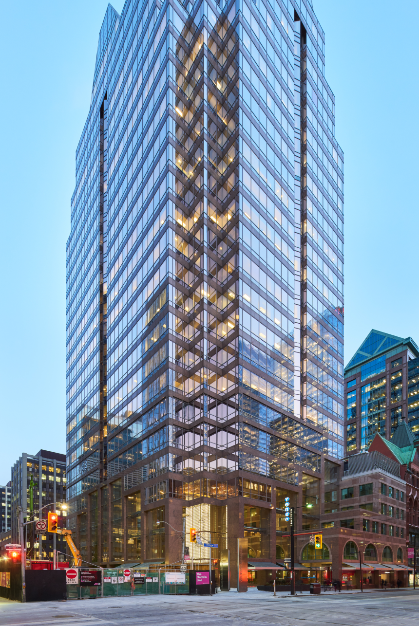 One Queen Street East is a unique 503,000-square-foot complex that harmoniously blends Toronto’s storied past with cutting-edge design. This remarkable property consists of two distinct buildings, seamlessly connected by a five-story glass atrium that serves as both a physical and architectural bridge between eras.